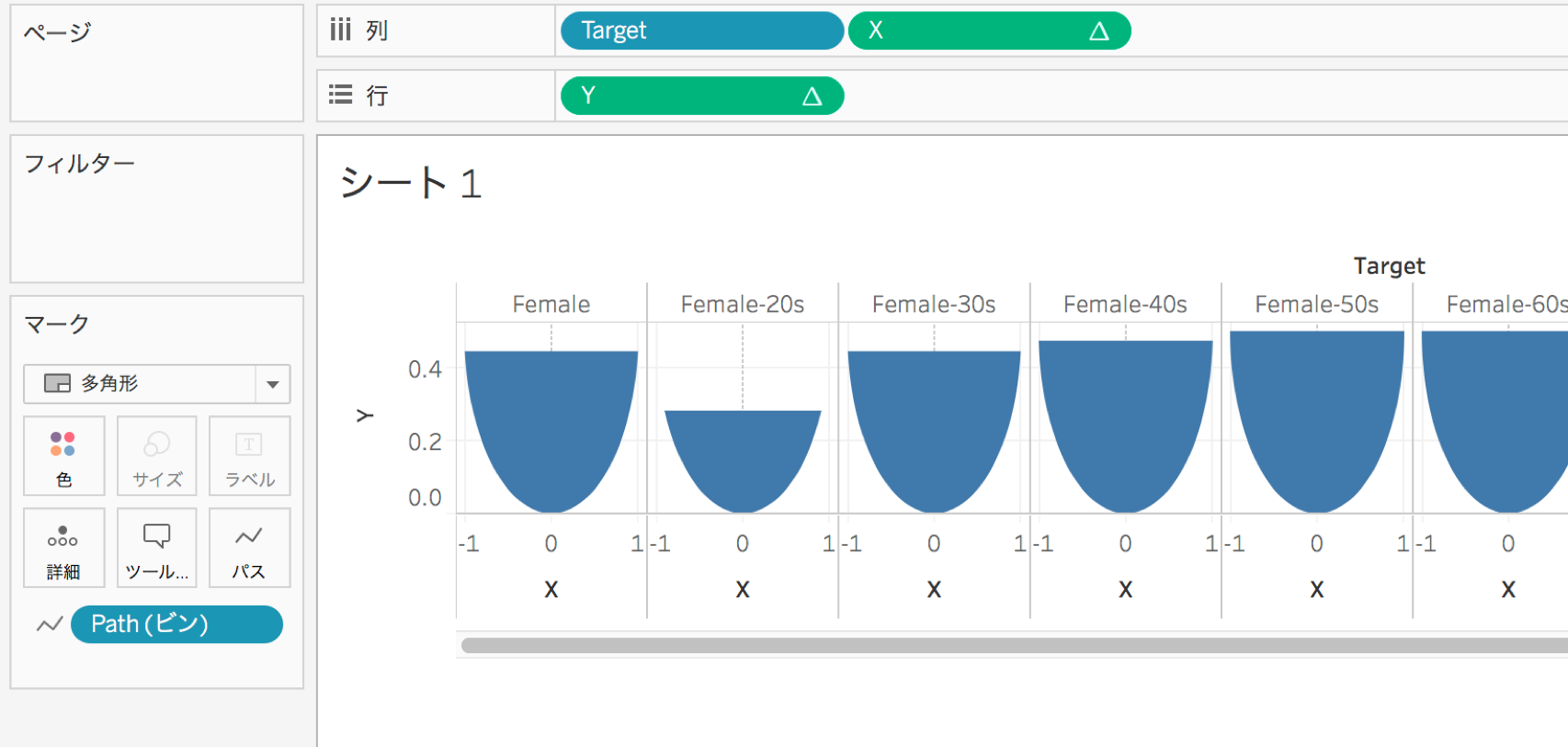⑥[Y (Full Circle)]を行の[Y]の左側に入れ、右クリック→「次を使用して計算」→[Path(ビン)]を選択。