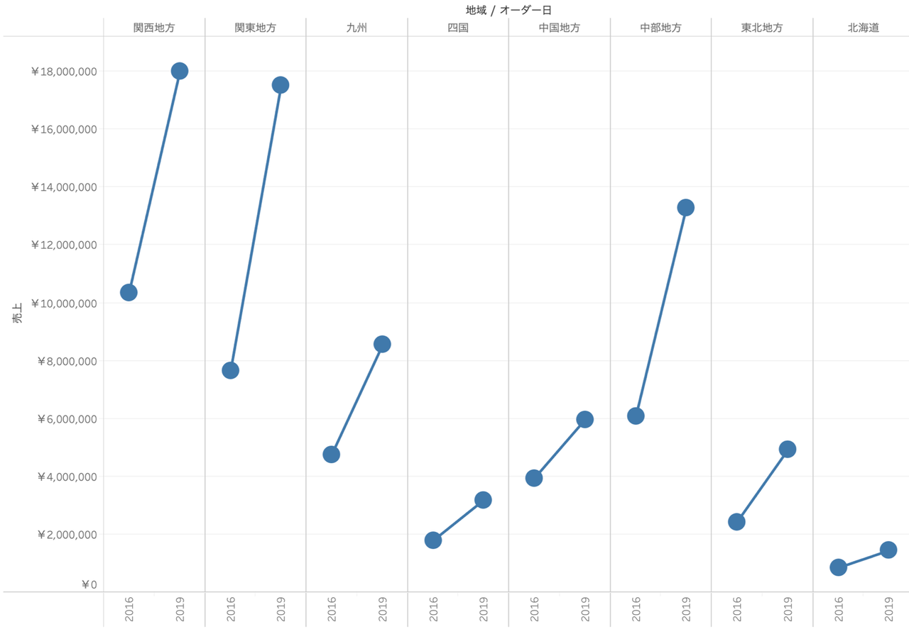 スロープチャートとは、2点の上がり下がりを可視化したグラフです。時系列推移でスロープチャートを使用すると、最初と最後でどのように変化したかという点に注目してデータを見ることができます。