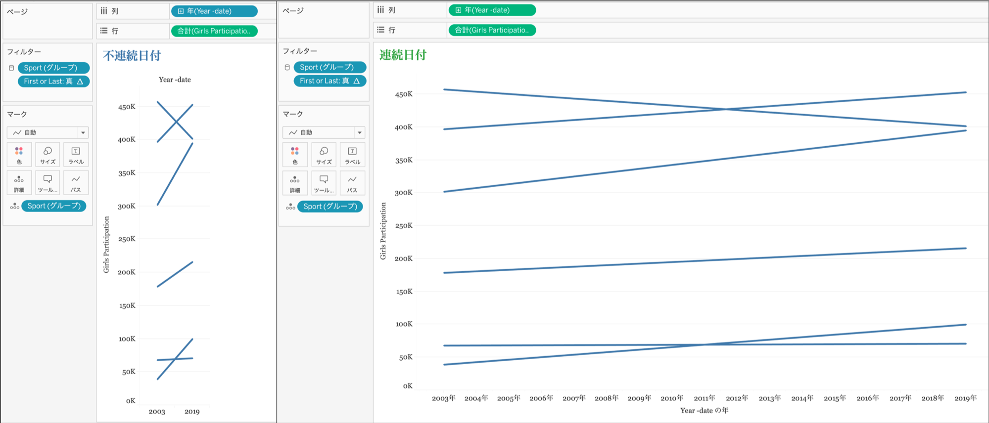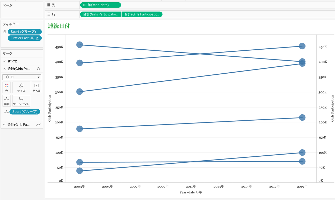 メジャーを二重軸にし、片方のマークタイプを円や形状に変えると、さらに最初と最後のポイントを強調することができます。