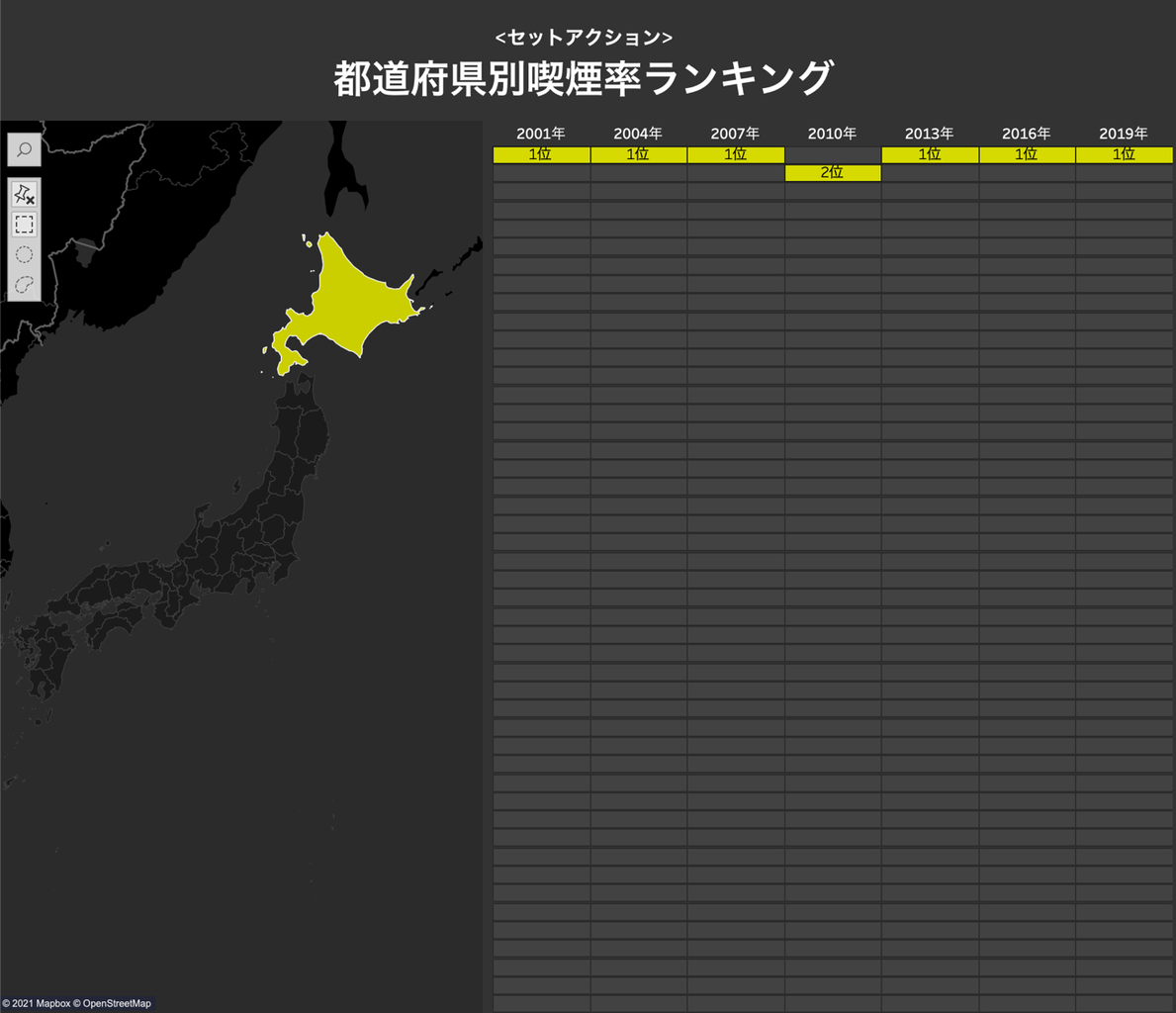 今回は国立がん研究センターの都道府県別喫煙率のデータを使用しました。セットアクションの設定手順は以下です。