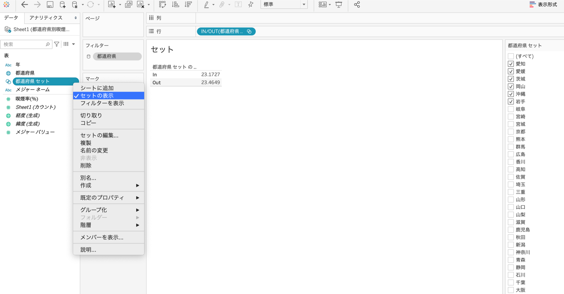 今回は都道府県セットのINに入っているか否かで色分けするダッシュボードを作成しました。