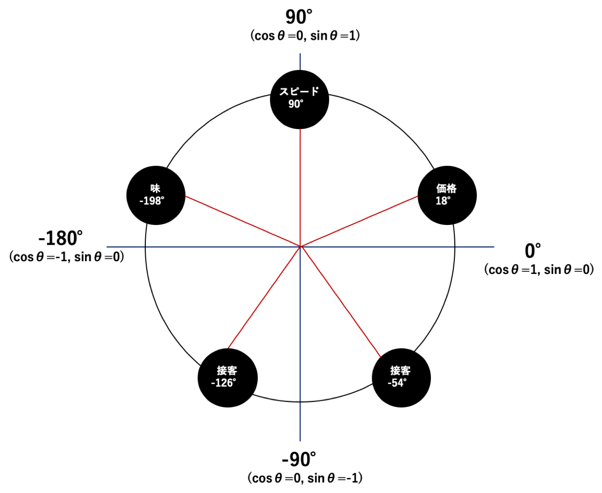 ※{ FIXED :COUNTD([質問])}ではディメンションのユニークな数をカウントして、1項目あたりの角度を計算しています。[質問]は「スピード」「価格」「接客」「内装」「味」の5種類があるので、1項目あたり72°ずつずれていきます。