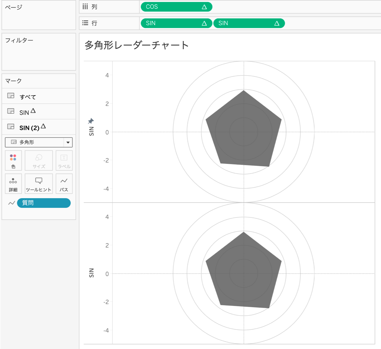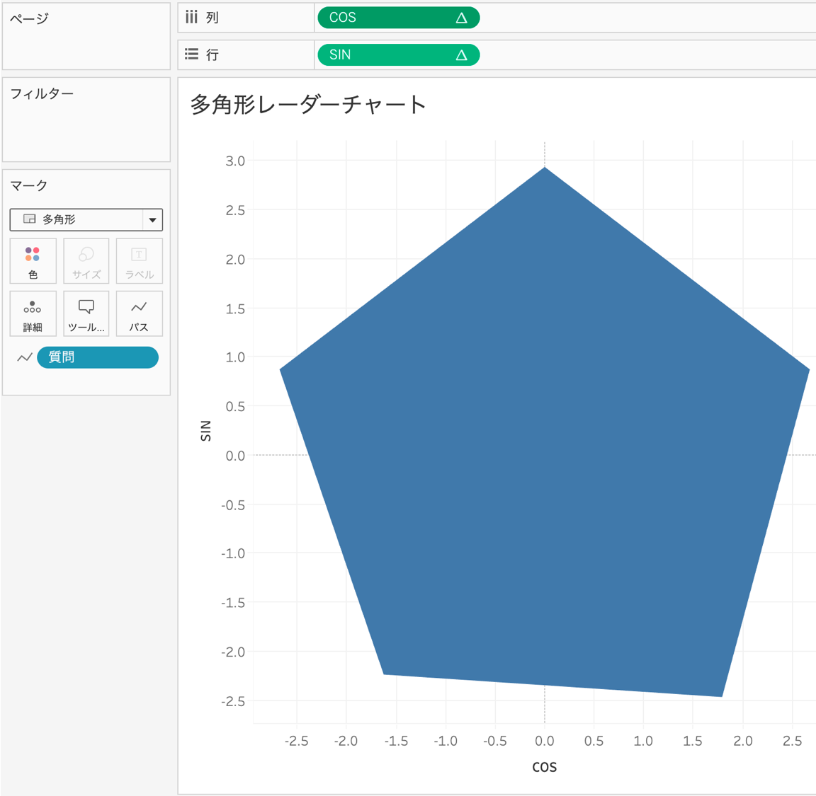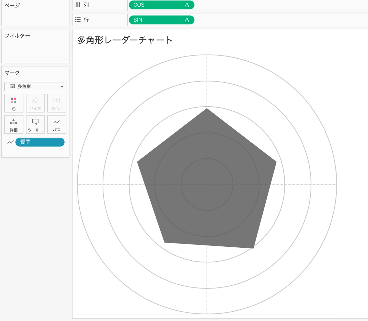 [COS]や[SIN]ではその角度を三角関数に変換し、回答のスコアを掛け算することで、スコアの大きさを三角関数に反映させています。(=スコアが大きいほど中心点から離れるようになる) - 「マーク」を多角形にし、「パス」に[質問]、列に[COS]、行に[SIN]を入れる。[COS]と[SIN]の表計算の設定は[質問]にチェックを入れる。