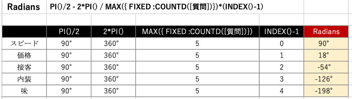 RadiansPI()/2 - 2*PI() / MAX({ FIXED :COUNTD([質問])})*(INDEX()-1)※MAX({ FIXED :COUNTD([質問])})の部分の集計方法はデータに応じて変えてください。