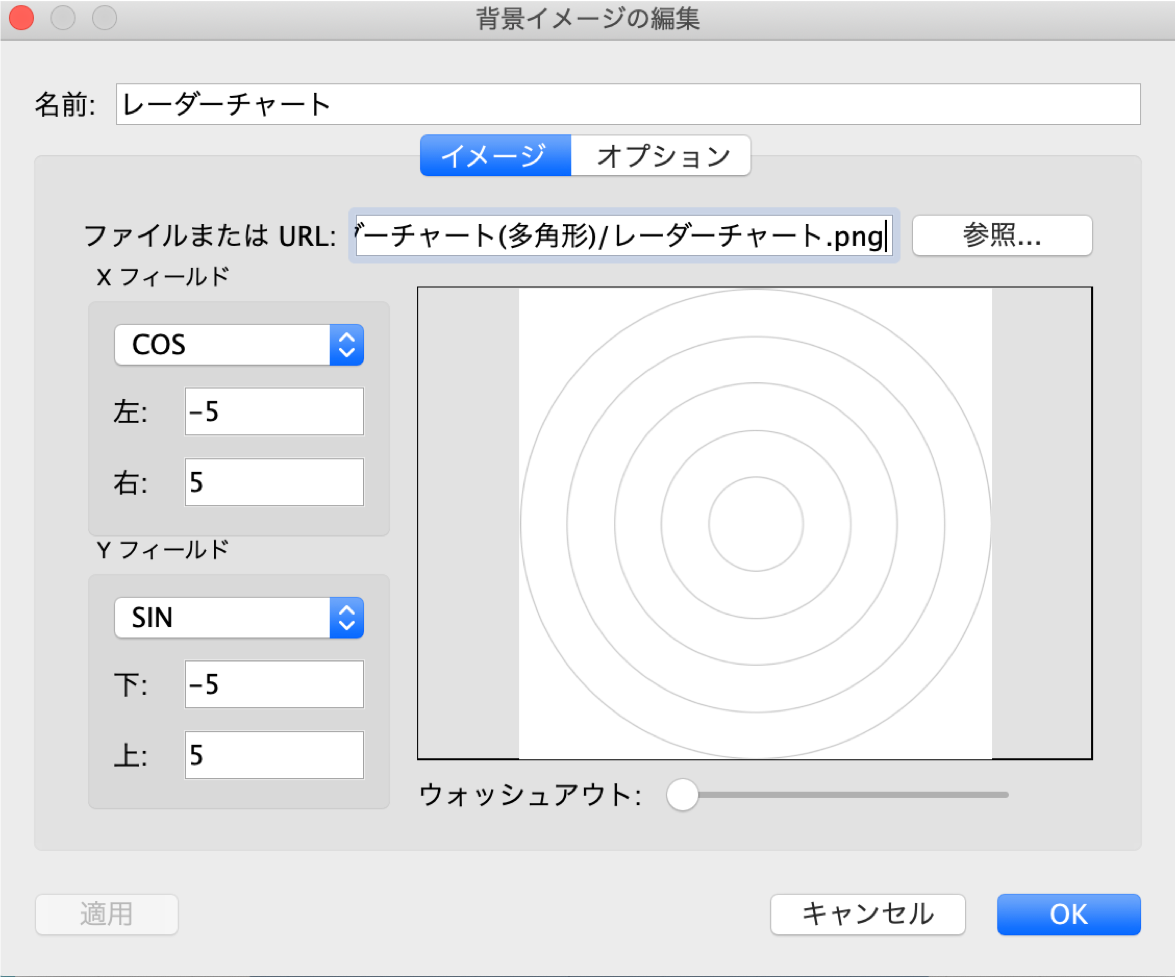 今回は[回答]のスコアが0~5の値を取るので、[COS]と[SIN]の範囲は-5~5の間になります。そのため、XフィールドとYフィールドの値もそのように設定しています。 - [COS]と[SIN]の軸の幅を-5~5で固定する (※使用するデータに応じて柔軟に設定してください)