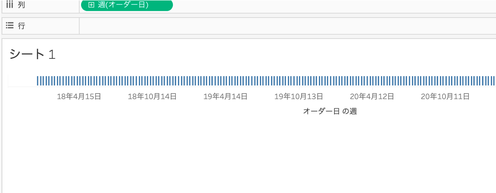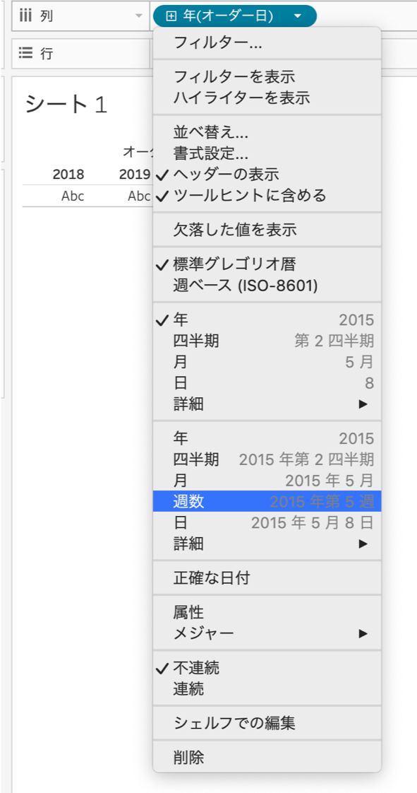 - [オーダー日]を右クリックし、「連続」の「週数」に変更する