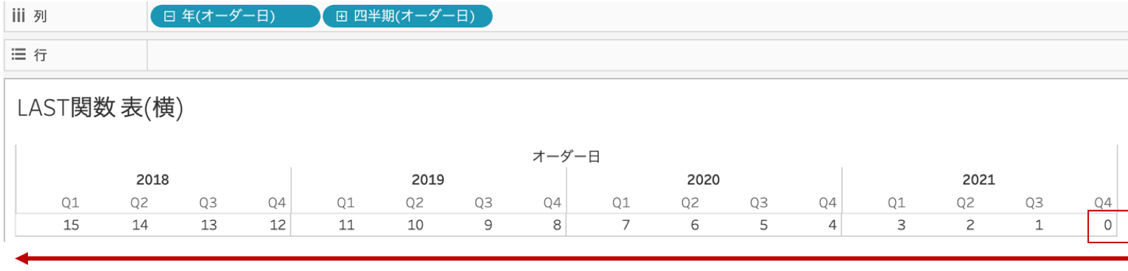 // LAST() = 0であれば「真」、それ以外であれば「偽」が返る計算式です。 - 列に[オーダー日]を入れる
