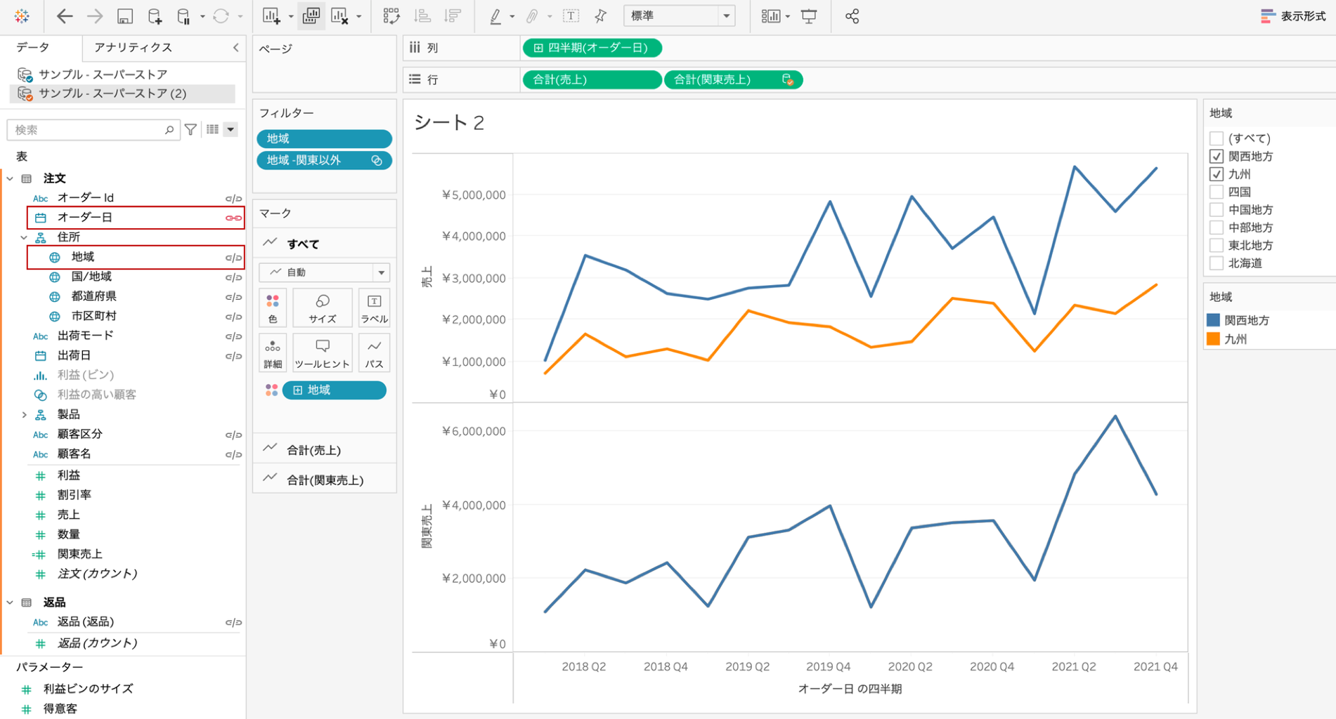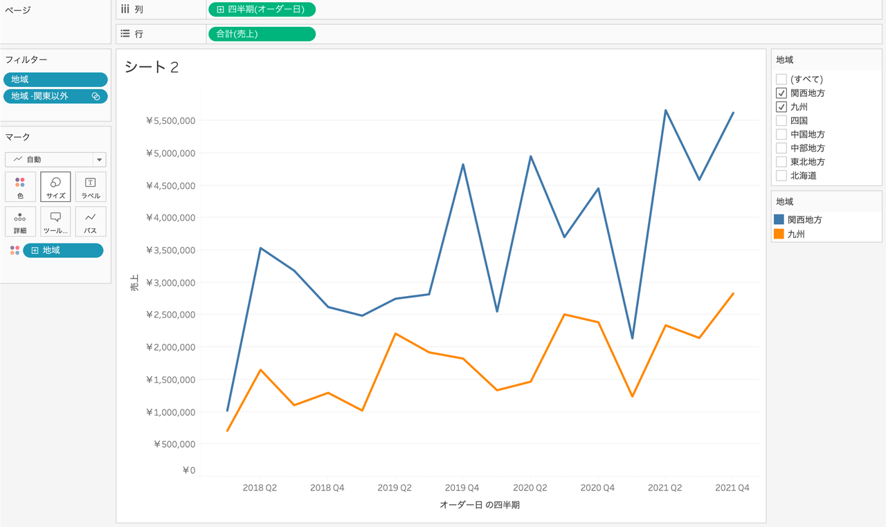 - 1で作成したセットと[地域]をフィルタに入れ、地域別の四半期ごとの売上推移を作成