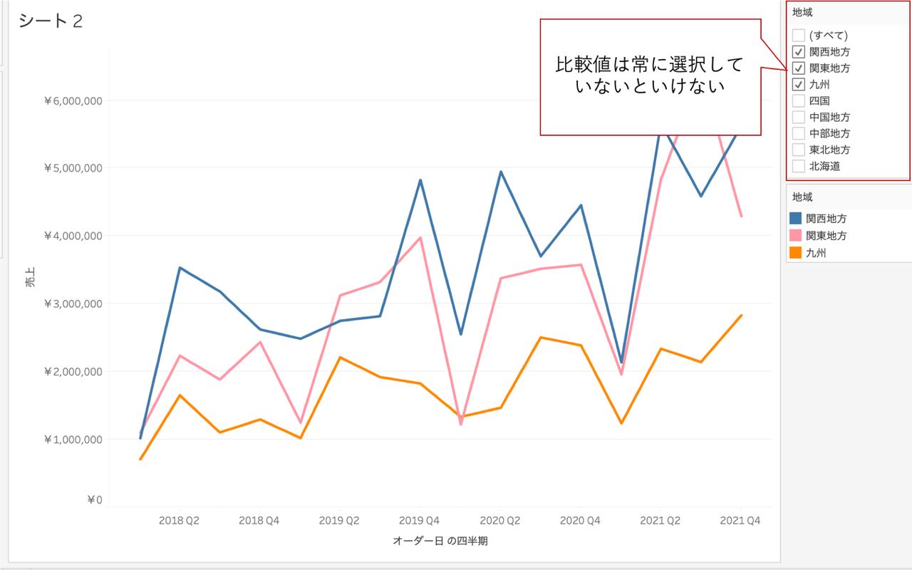 例えば地域別の売上を見る際に、関東地方の売上は基準として常に固定して表示させ、それ以外の地域の売上は比較値としてフィルタで選択しながら表示させたい、といったケースです。