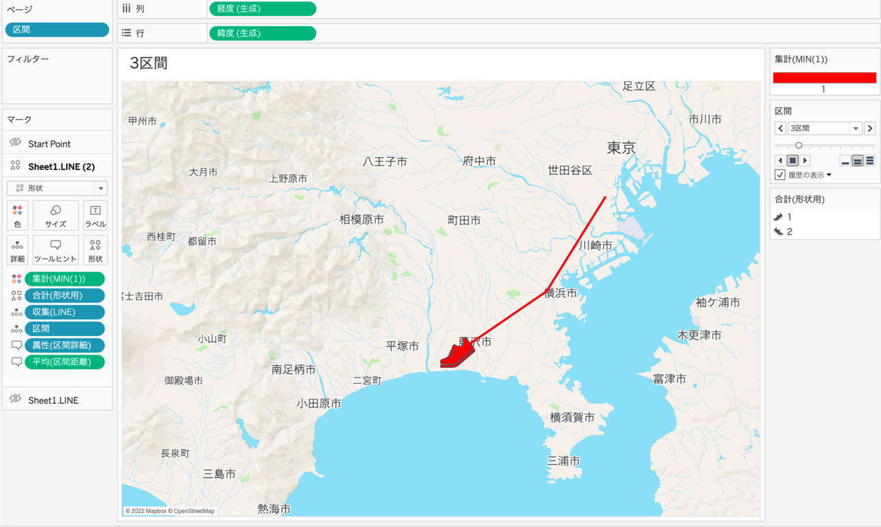 以前、「TableauのMakeline関数(空間関数)を使ってみた」にて検証した方法を使って、各区間の開始と終了をつなぐようにします。