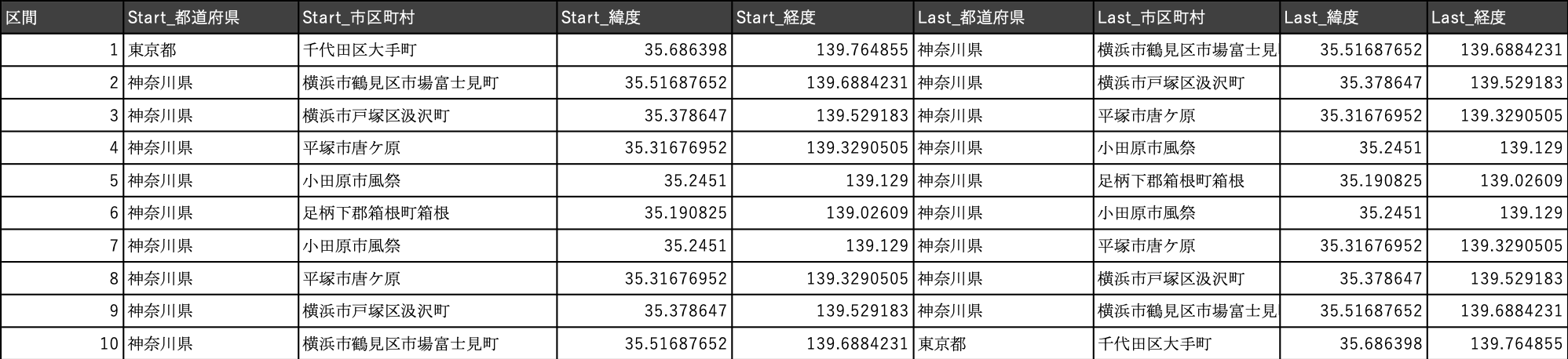 箱根駅伝は往路の1区~5区と復路の6区~10区をリレー方式で走ります。この区間をマップで表示するため、下記のようなマスタを作成しました。