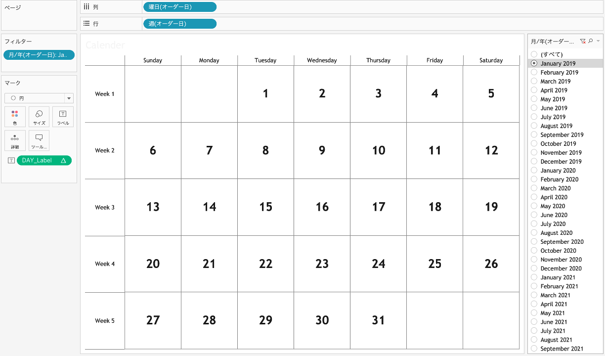 今回はカレンダーとしての見栄えをよくするため、下記の方法で欠損している日を表示しています。