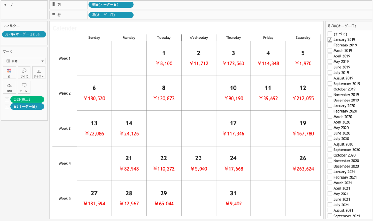 カレンダーチャートは、その名の通り、カレンダーのような見た目で表現したグラフのことです。