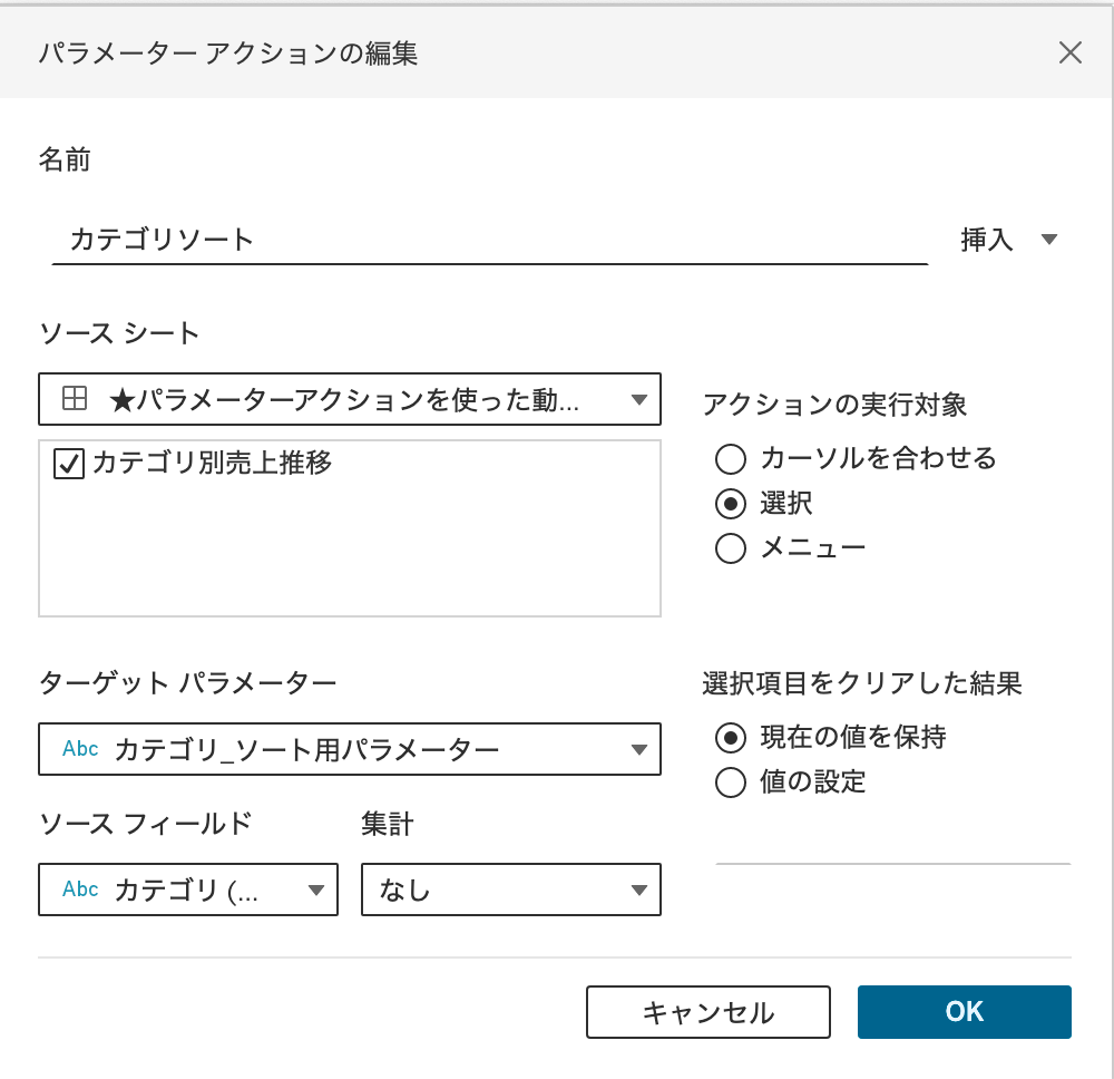 「ソースフィールド」(今回は[カテゴリ])を「選択」すると、「ターゲット パラメーター」(今回は[カテゴリ_ソート用パラメーター])の値が、選択したものの値に置き換わるという設定です。