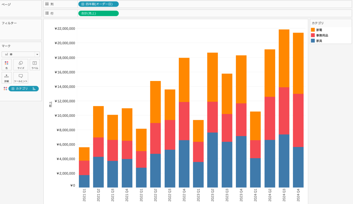 まずはサンプルスーパーストアのデータを用いて、四半期別に[カテゴリ]が積み上がった棒グラフを作成します。