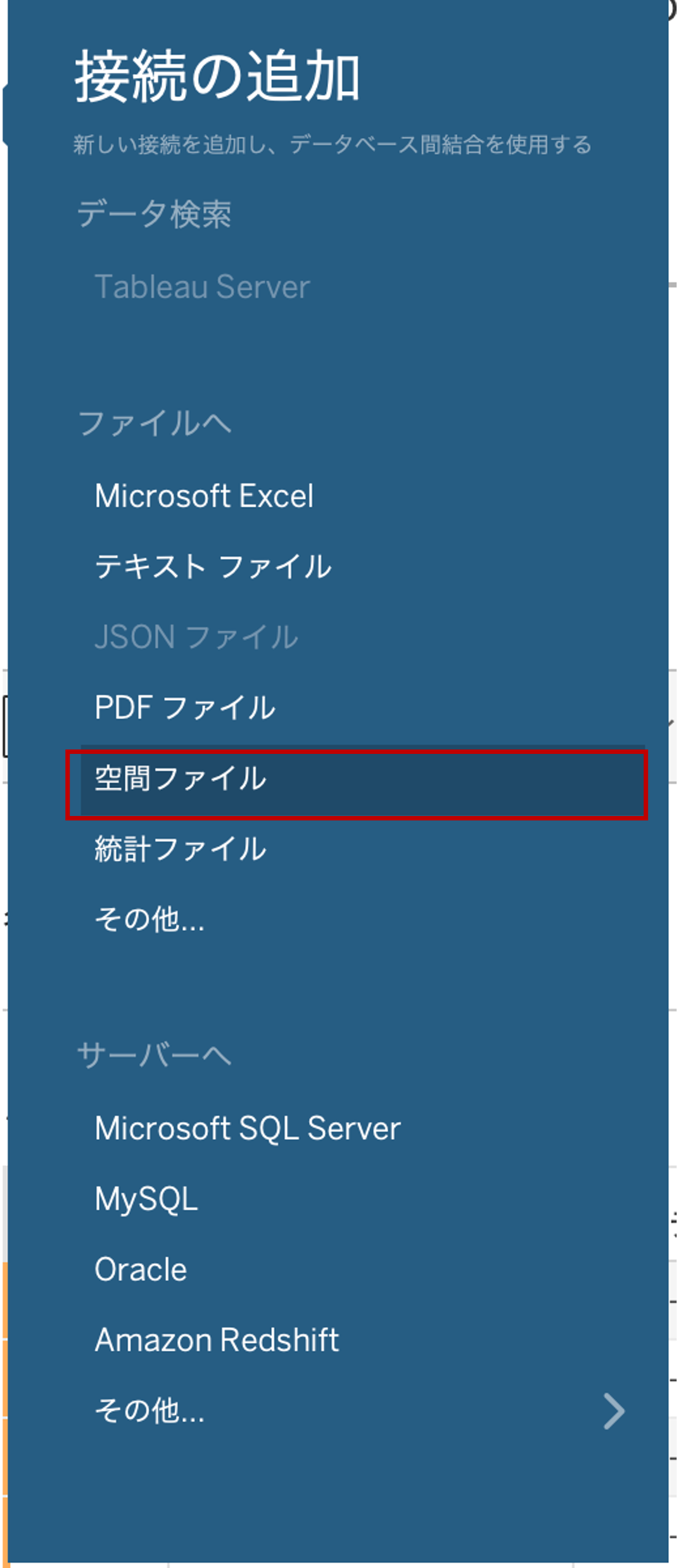 geojsonファイルを指定する際は、「空間ファイル」を選択。