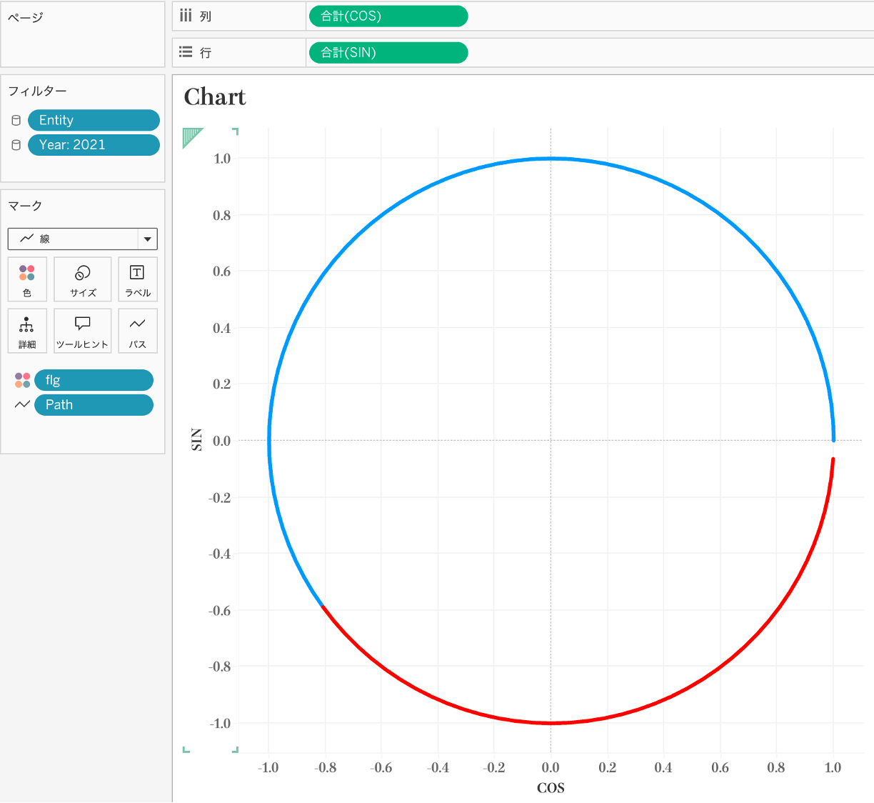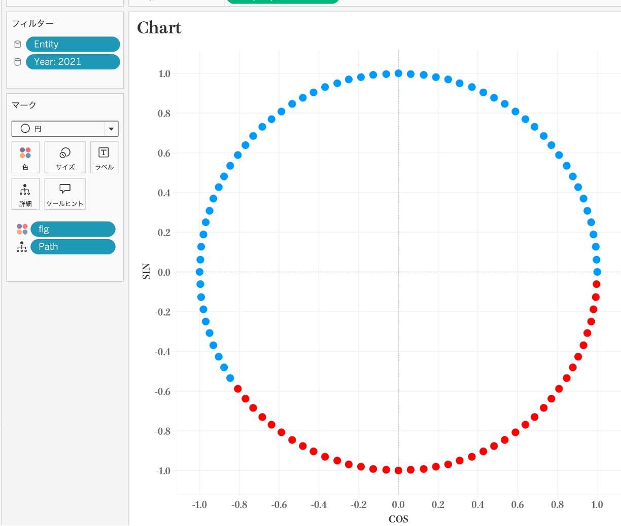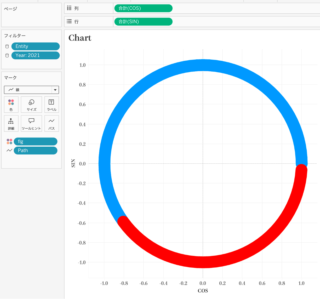 表示形式を線にし、[Path]を「パス」の中に入れると、ドーナツチャートのような表現になります。線の太さを変えると少し印象を変えることもできます。