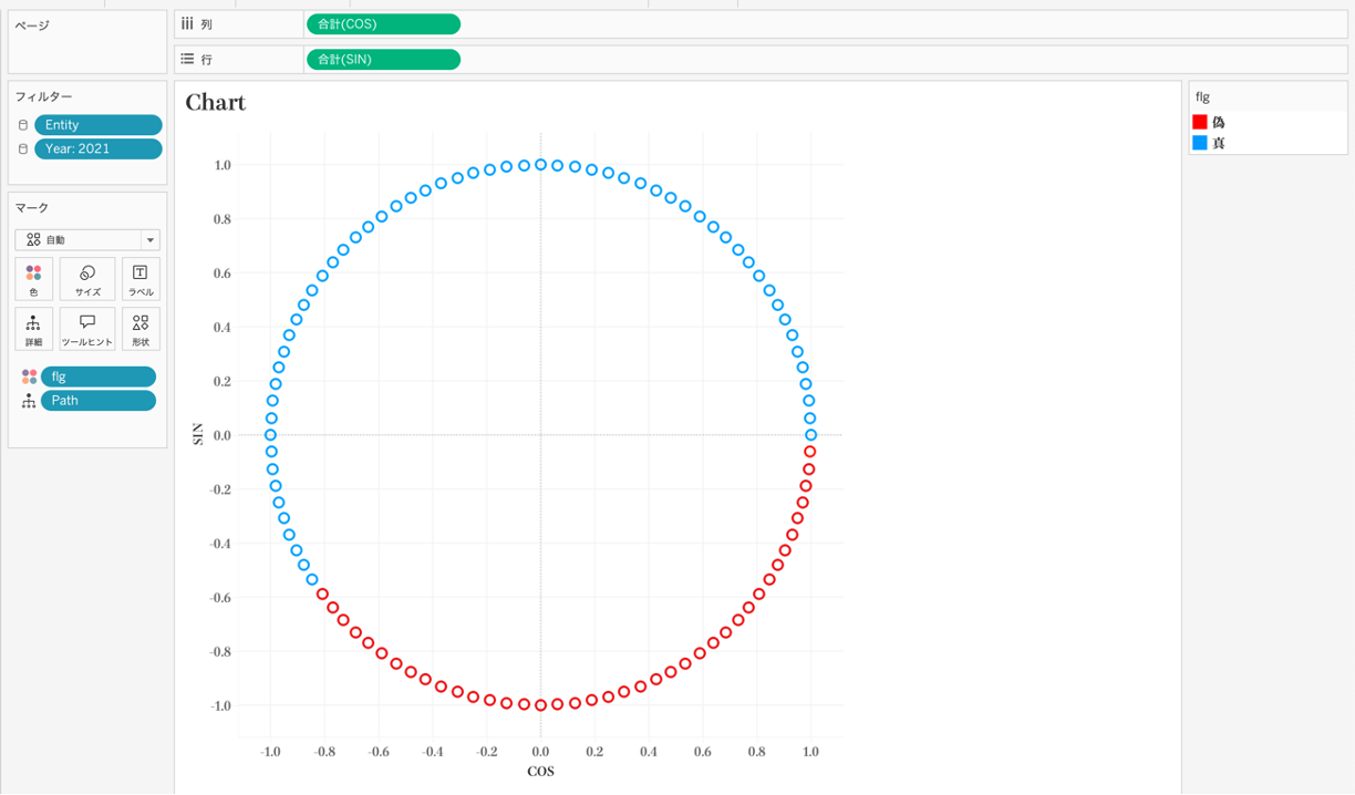 表示形式を多角形にし、[Path]を「パス」の中に入れると、面を塗りつぶした表現になります。少し変わった表現になりますが、面を塗りつぶすことで割合の比率をより強調して表現することができます。